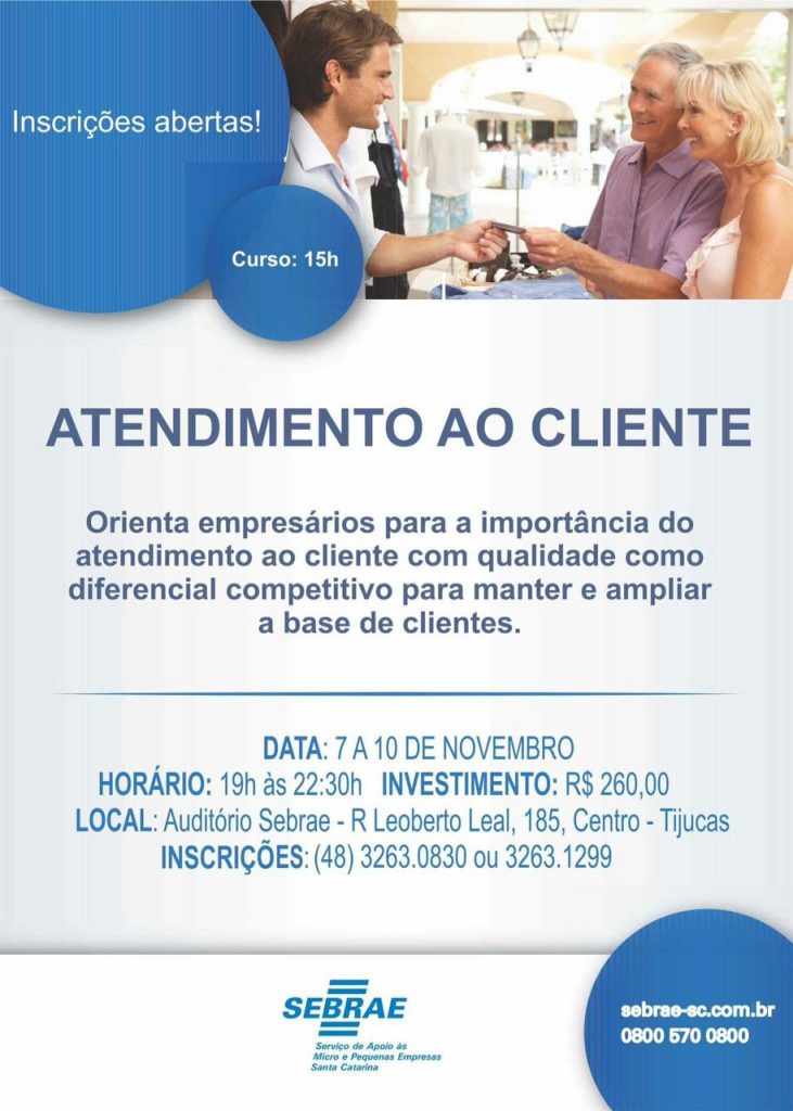 Sempre atento às exigências do mercado, e preocupado em garantir o sucesso dos microempresários, o Sebrae já está com inscrições abertas para mais um curso que trata justamente do atendimento ao cliente. Serão três dias de ensinamentos para a vida toda – no período noturno, depois do expediente comercial –, no auditório da entidade, em Tijucas.