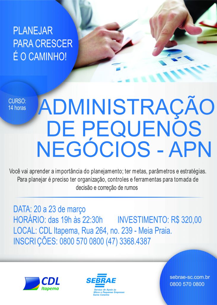 Entre os dias 20 e 23 próximos, em 14 horas de ensinamentos e experiências, empresários e colaboradores com funções administrativas se reúnem na sede da CDL (Câmara de Dirigentes Lojistas) de Itapema, das 19h às 22h30, para crescerem em conjunto. As inscrições seguem abertas pelos telefones 0800-570-0800 e (47) 3368-4387.