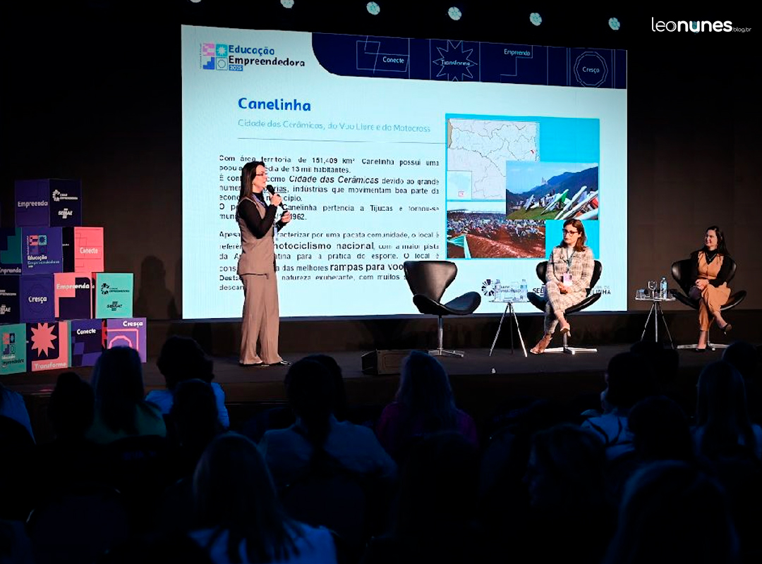 Mais do que presença de plateia, Fernanda foi protagonista no painel “Jovens Empreendedores Primeiros Passos”, em que relatou os bastidores, desafios e avanços da implementação do projeto em Canelinha desde 2021. A secretária também concedeu entrevista ao podcast Educação em Movimento, ampliando ainda mais sua projeção fora dos limites do município.