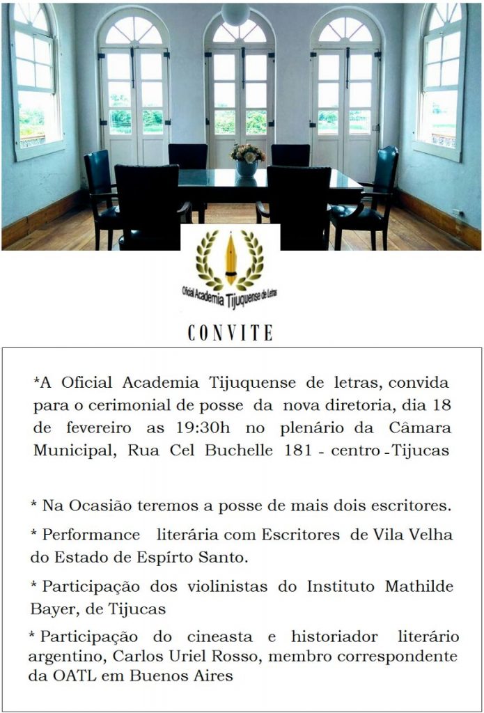 Além da posse de dois membros, da performance literária com escritores de Vila Velha (ES) e do concerto dos violinistas do Instituto Mathilde Bayer, de Tijucas, a OATL (Oficial Academia Tijuquense de Letras) reúne imortais e convidados ilustres a exemplo do cineasta e historiador literário argentino Carlos Uriel Rosso, membro correspondente da entidade em Buenos Aires para a cerimônia de oficialização da nova diretoria, amanhã, às 19h30, no plenário da Câmara Municipal.