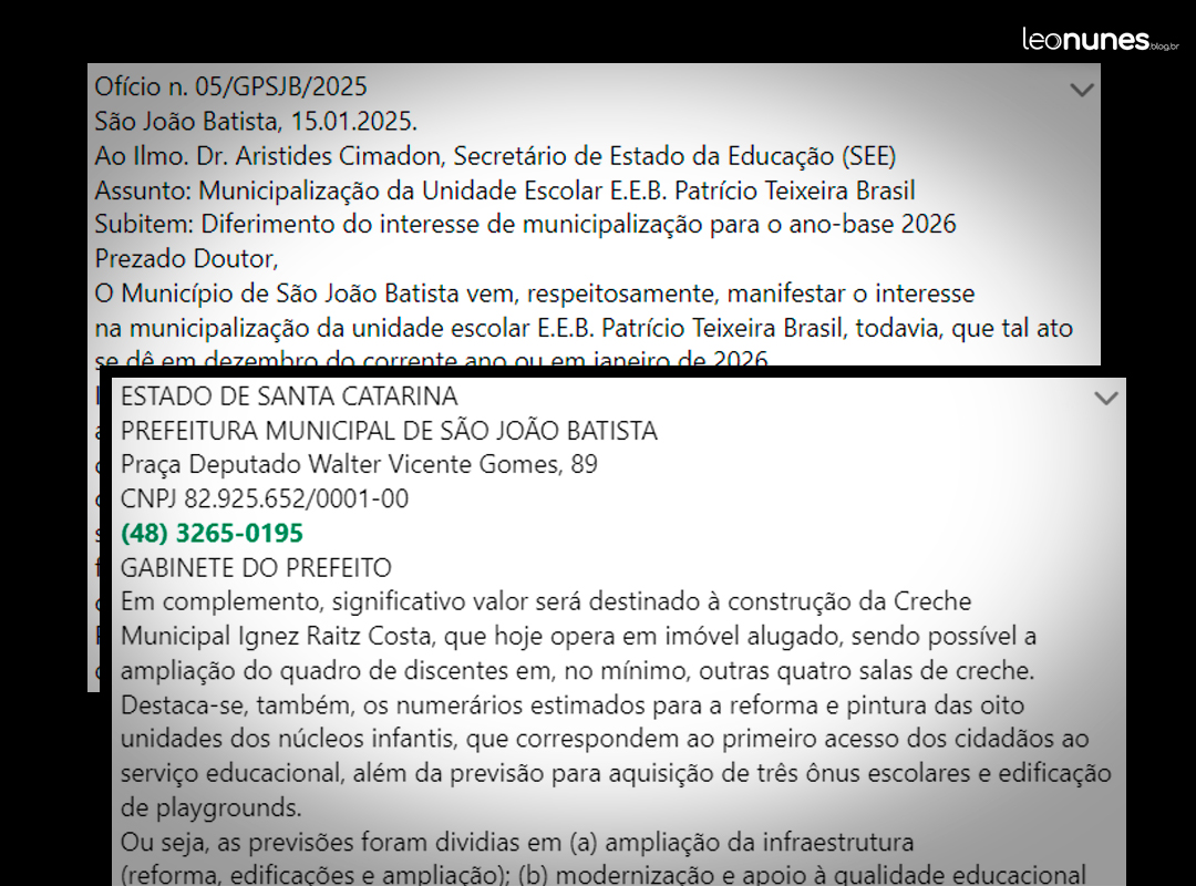 Em São João Batista, a municipalização da Escola de Educação Básica Professor Patrício Teixeira Brasil virou uma disputa de paternidade. De um lado, o prefeito Juliano Peixer (UNIÃO) garante que a ideia nasceu no Governo do Estado. Do outro, os documentos — assinados por ele próprio — contam uma história diferente.
